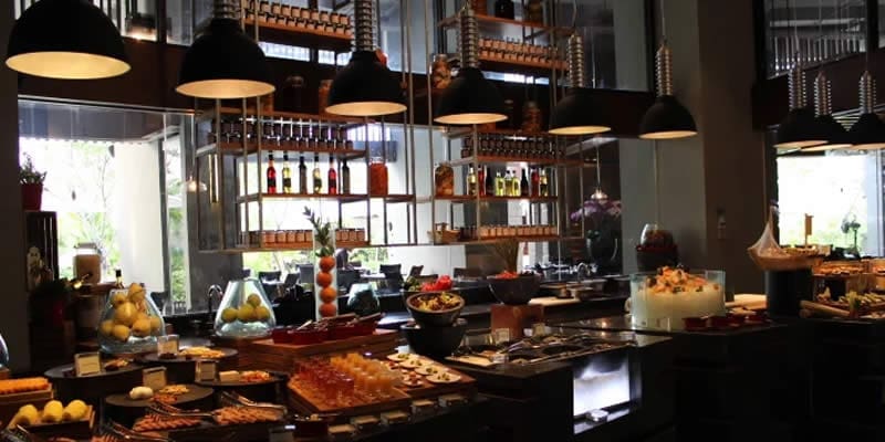 全店採全自助式取餐方式除了自助吧台上的熟食,另有現做可可餅、現煮熱呼呼峇里式湯麵、知名品牌冰淇淋…現烤BBQ肉串及蝦…等每天不定期的更新菜單。廚房採全開放式,讓您看的到大廚們的好手藝哦。