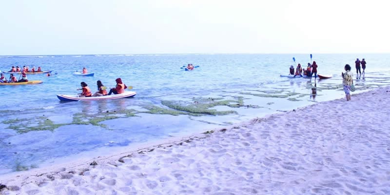 來到巴里島當然不能辜負沙灘、碧海、藍天的呼喚!特別選擇在這裡…因為海底地形曲折勾引了潮水跳舞的興致,一艘艘獨木舟搖擺了起來,彷彿是一場以碧海為舞池、點著兩根超級大蠟燭的黃昏舞會。