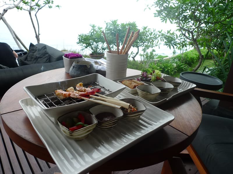 帶您來到巴里島最漂亮的蔚藍天空下休息品嚐下午茶,在這您也可同時感受在海灘卉跑或漫步在沙灘上的浪漫情懷。正在滿心期待精緻甜點上桌時,先端的是一盤鹹點。主廚保留了英式下午茶味覺上由淡而重的傳統順序,一個半透明的盤子中盛裝了四種鹹食,造型搭配有和風也有義式風味…接著是一杯冰涼的微飲拉開甜點的序幕,主廚將口感調製得較一般奶酪較為軟嫩,由下而上連同莓果醬、酥餅及巧克力慕斯同時入口,酸甜綿酥脆同時在口中呈現,這杯奶酪除令人稍驚豔外,似乎也有幾分飽了,建議此時喝杯茶休息一會,再繼續令人期待的…. 讓人充滿驚喜。
