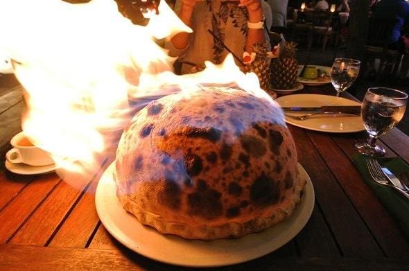 披薩的外觀看起來像顆球,上桌的時候,還要在餅皮上,淋一點萊姆酒再點火,讓您在吃飽的同時,也看了一場表演。圓滾滾的披薩一送來,立刻吸引您目光,因為這膨脹的餅皮,簡直就像半顆籃球大小,淋上萊姆酒再點火,凹陷的餅皮立刻恢復原狀,接著用刀沿著邊緣把餅皮切開,裡投滿滿的餡料,讓人看得快要流口水,來上一口,果然滿足大小孩的胃。這火山披薩不只滿足饕客的胃,吃過的人都可以嘖嘖稱奇。也替您帶來一場精采的視覺饗宴。