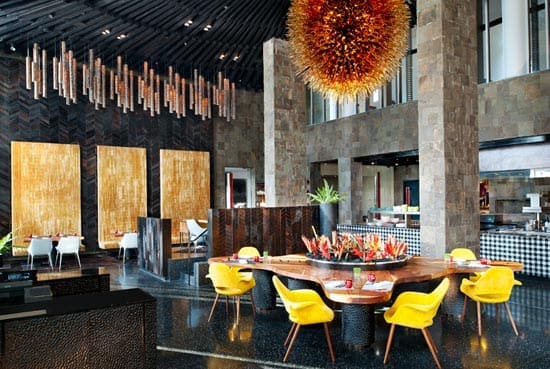 【體驗火之晚餐Fire Restaurant】-餐廳中央造型搶眼的吊燈,設計師靈感源自於峇里島傳統舞蹈KECAK DANCE(火舞)中的營火,其下的桌椅擺設彷彿是火舞中圍成一圈吟唱的男子…令人佩服W的創意及想像,融合了現代與傳統卻不顯衝突,反而有另一番專屬W Bali 的時尚品味。