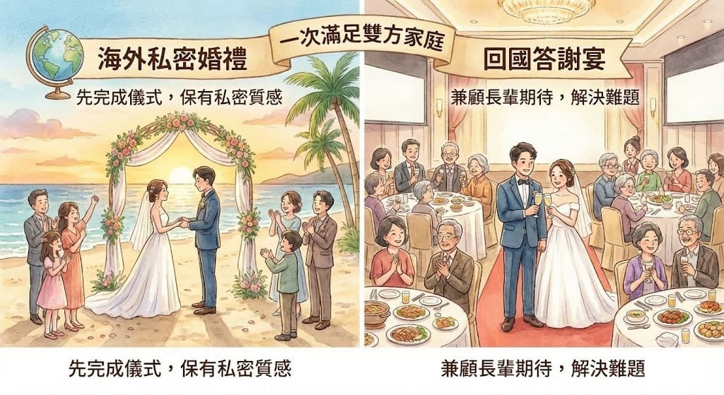 可選擇海外婚禮+回國答謝宴,兼顧新人理想與家人期待。