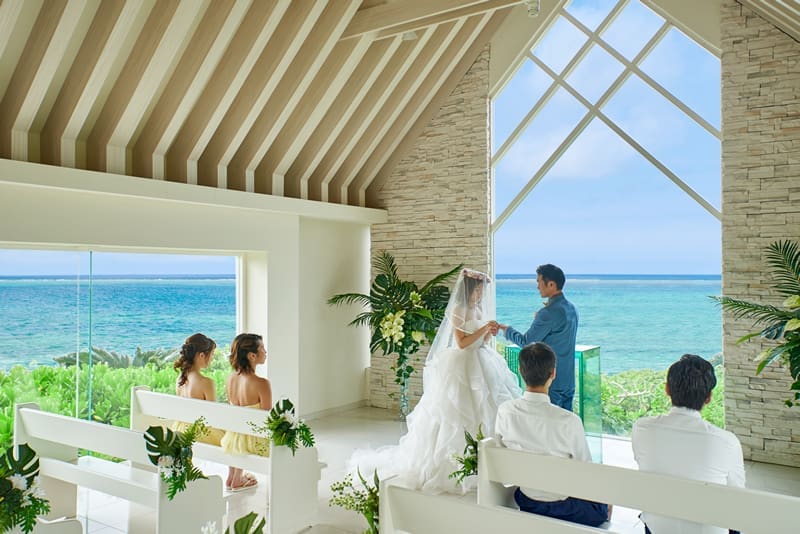 沖繩BLUEMOON教堂(Blue Moon Chapel)位於恩納村的海濱,從那霸機場出發車程約60分鐘。教堂以純白色為基調,搭配大片落地窗,讓自然光灑入,營造出明亮通透的空間感。內部裝潢融合琉球石灰岩元素,展現南國風情。教堂可容納約30位賓客,適合舉辦溫馨的小型婚禮。其簡約優雅的設計,讓新人在海天一色的美景中,締結永恆的愛情誓言。​