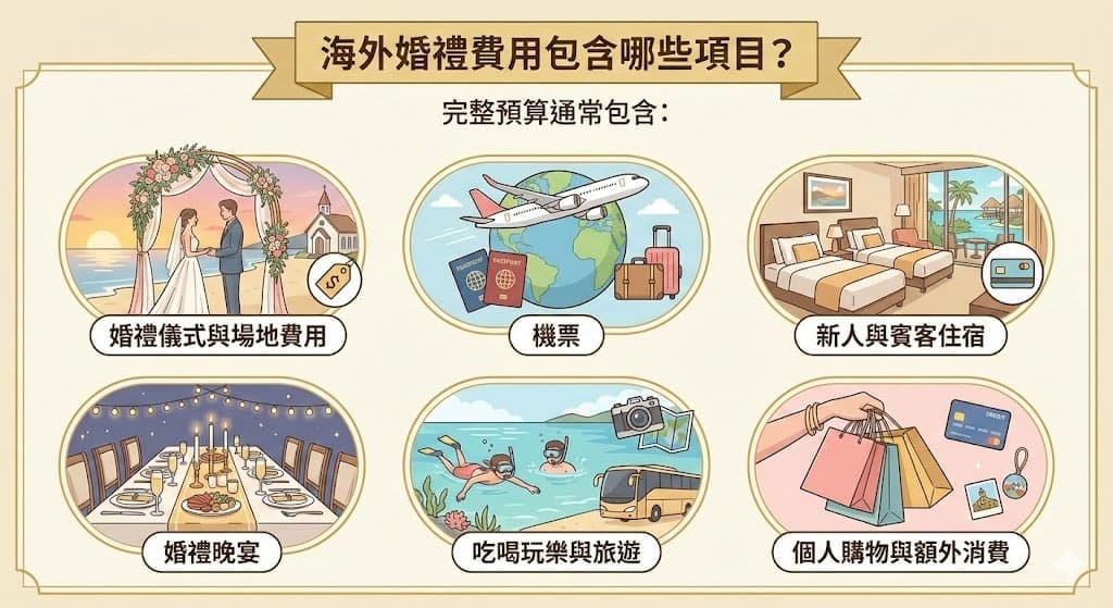 海外婚禮並不是只有「婚禮儀式」本身,完整預算通常包含: