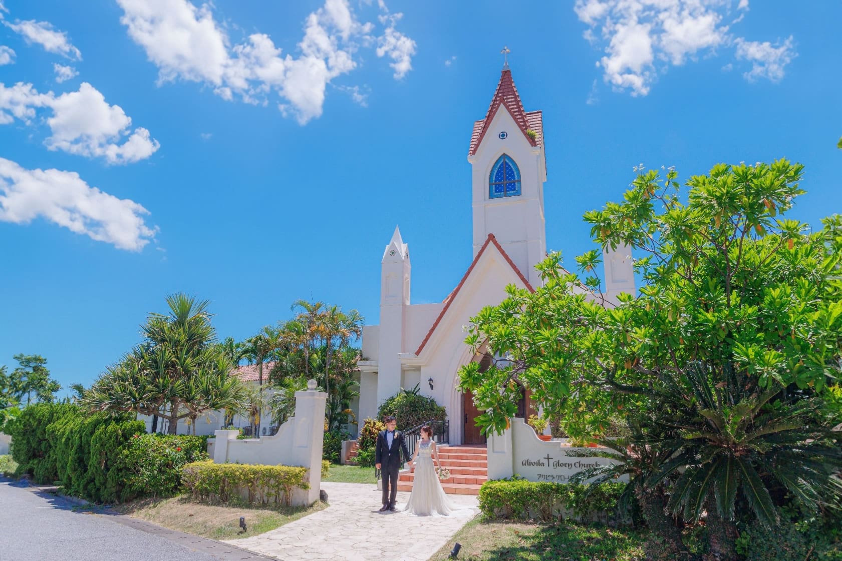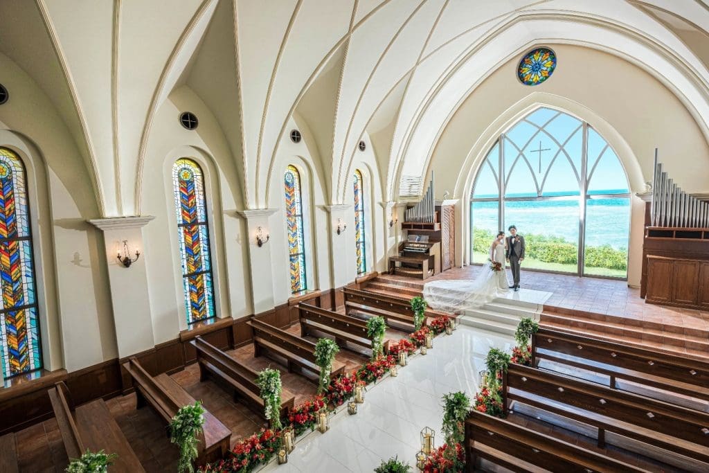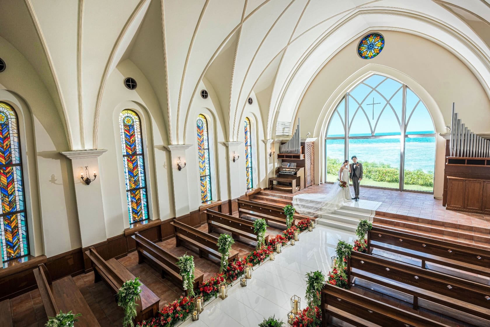 採西班牙式的建築風格,白牆與紅瓦屋頂是葛洛麗教堂的最大特色,紅瓦屋頂在沖繩象徵富裕、幸福和諧。古典風情婚禮殿堂,聖歌美聲縈繞迴盪讚頌愛情,聖歌與管風琴聲,沈穩樂聲迴盪在教堂高殿,是能讓所有貴賓永生難忘的感人婚禮。