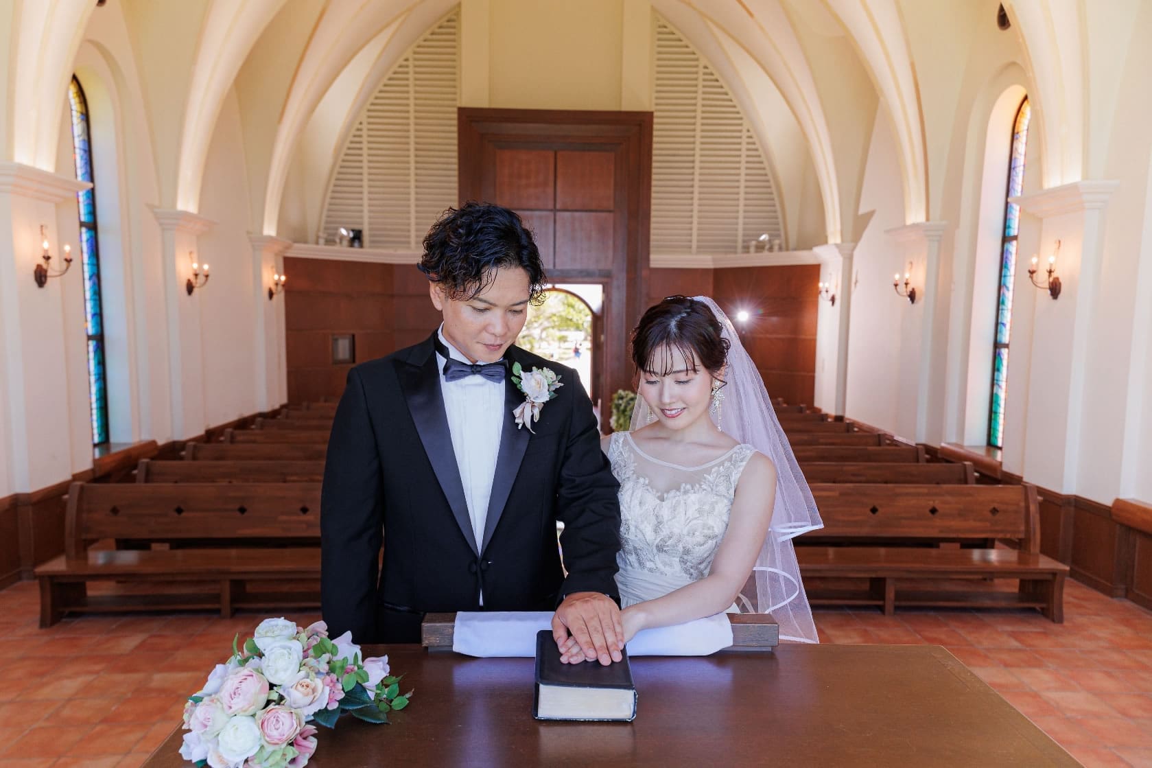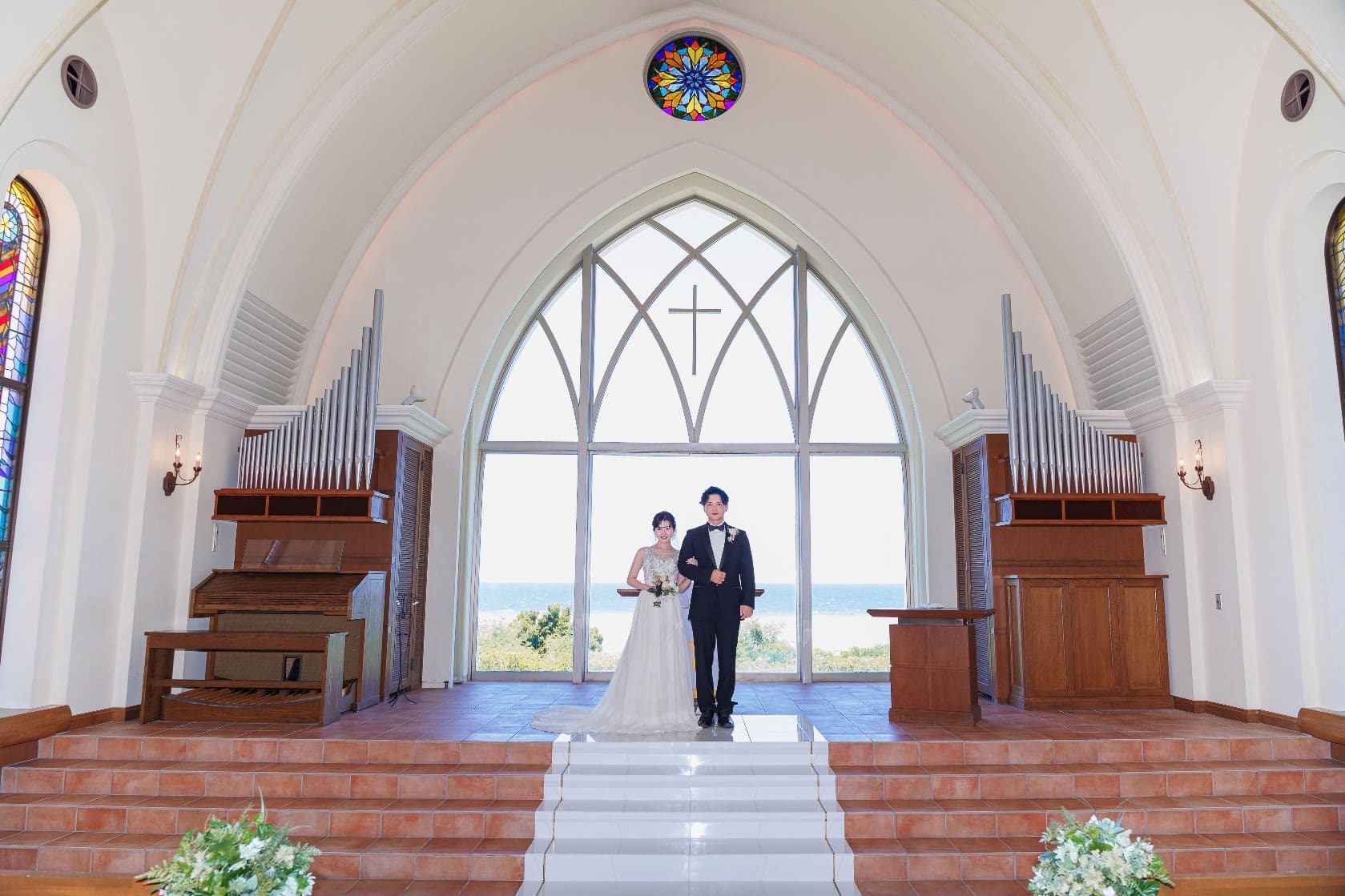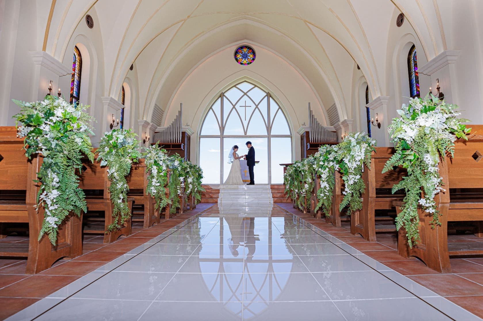 採西班牙式的建築風格,白牆與紅瓦屋頂是葛洛麗教堂的最大特色,紅瓦屋頂在沖繩象徵富裕、幸福和諧。古典風情婚禮殿堂,聖歌美聲縈繞迴盪讚頌愛情,聖歌與管風琴聲,沈穩樂聲迴盪在教堂高殿,是能讓所有貴賓永生難忘的感人婚禮。