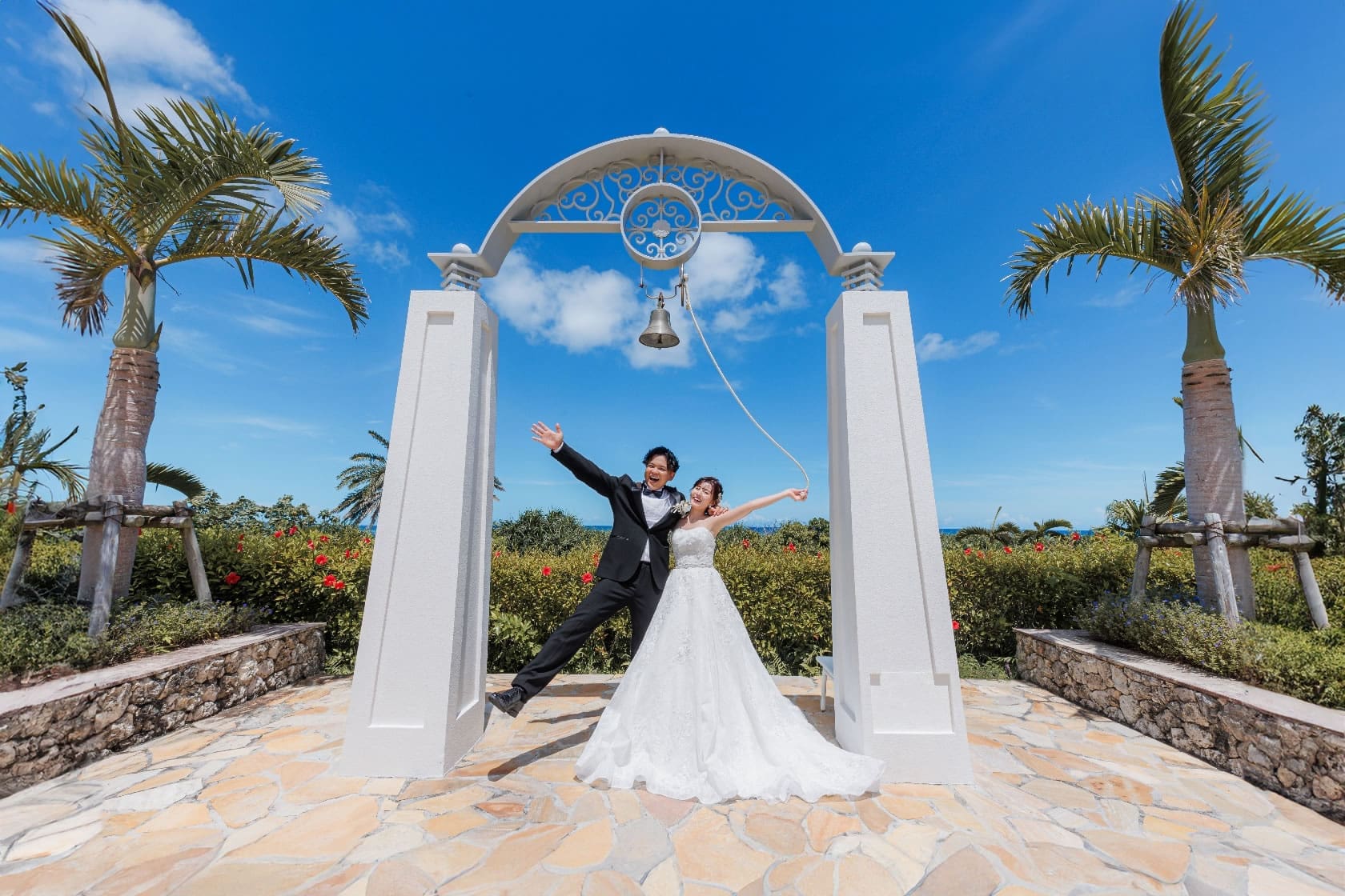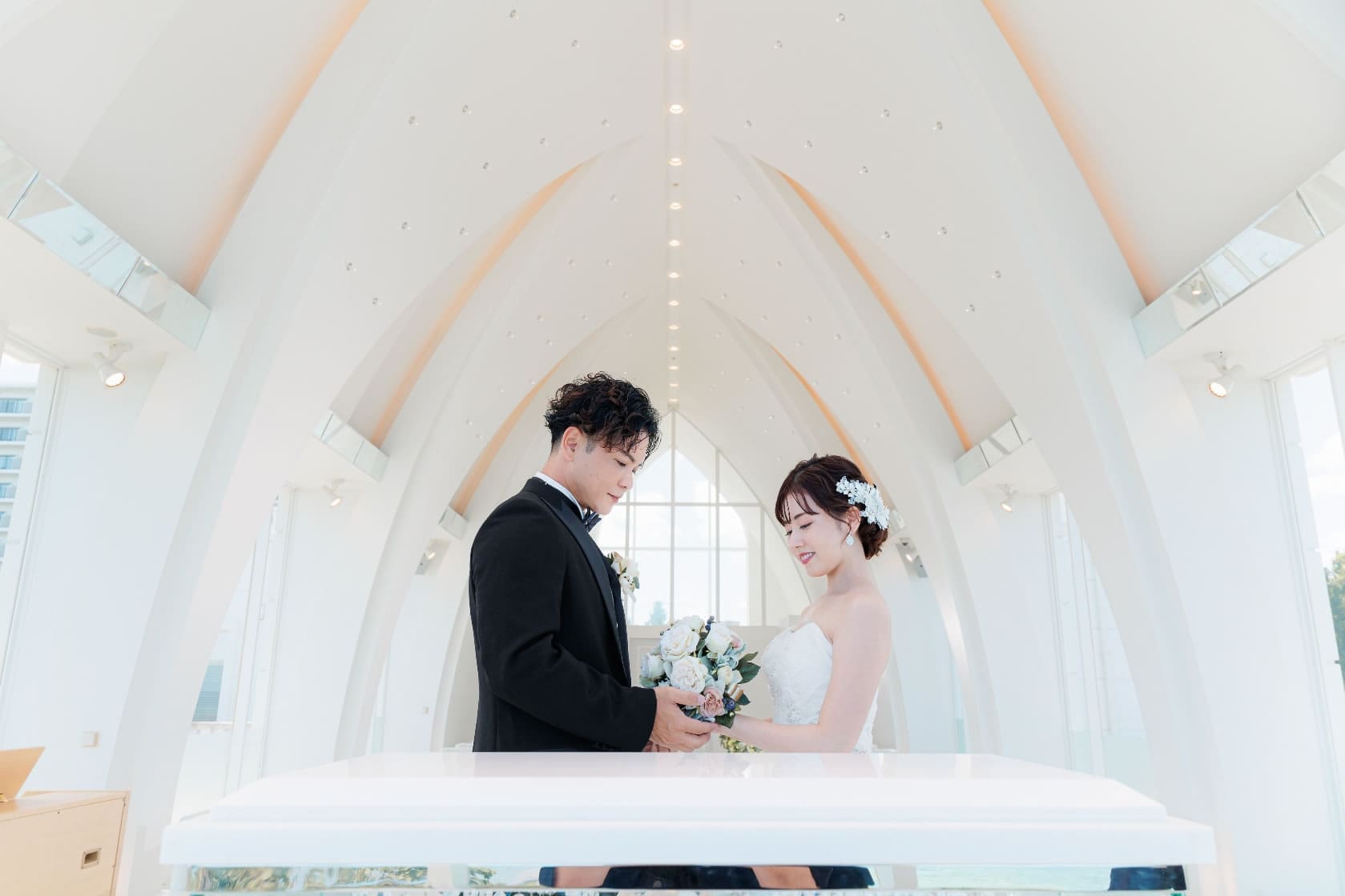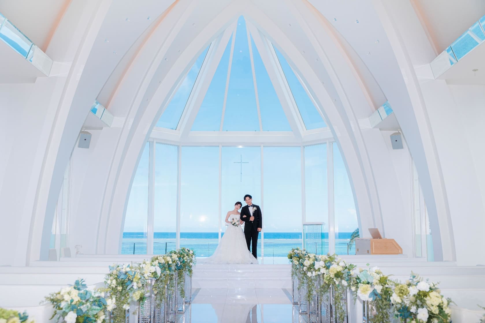 英倫式貴族教堂,融入沖繩獨有的碧海藍天,教堂採用白色主調,配襯白色大理石與落地玻璃,教堂外的寬闊樓梯伸延至花園,教堂華麗的氛為感,充滿著幸福與浪漫。實現兩人的夢幻婚禮。