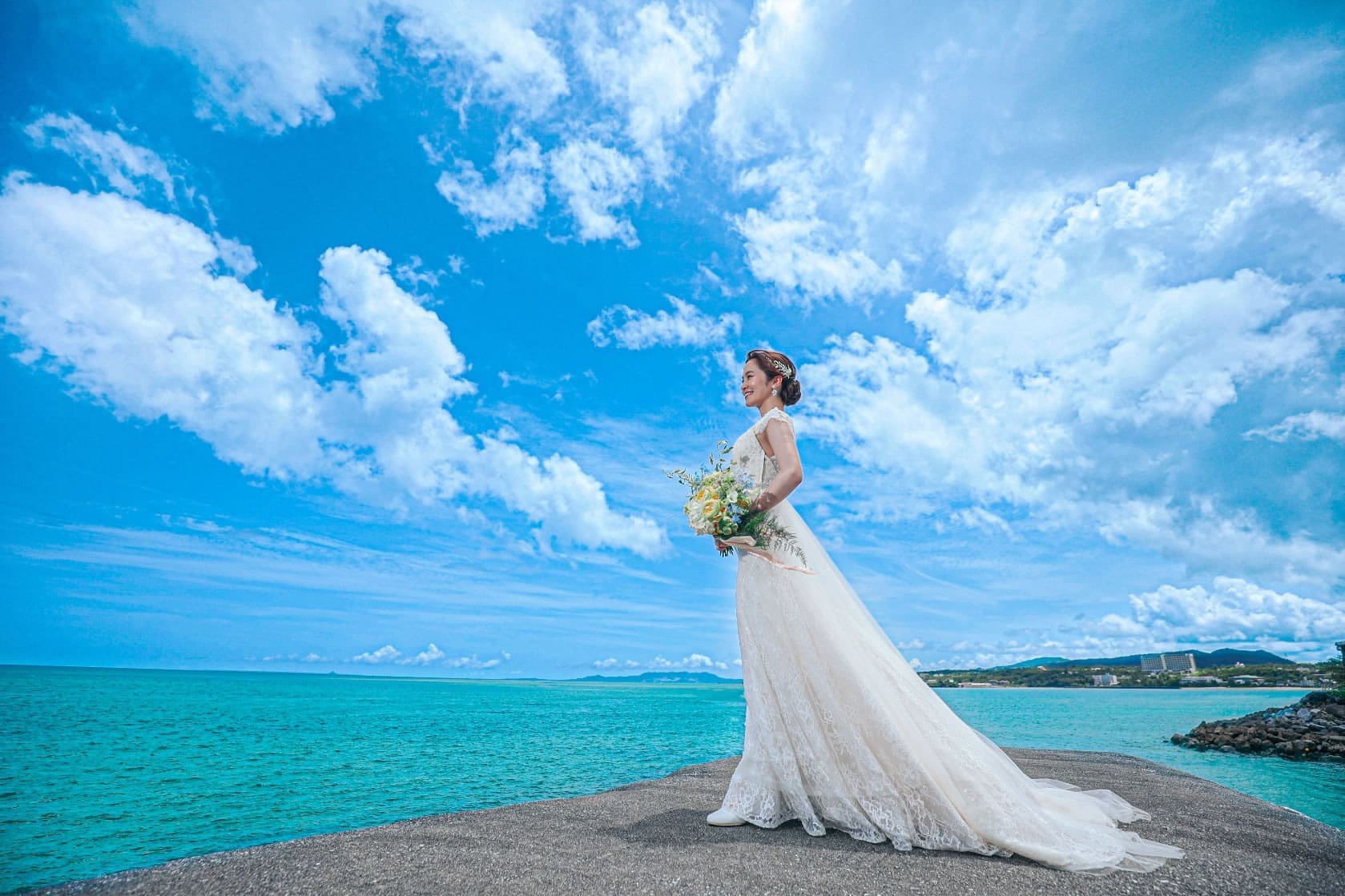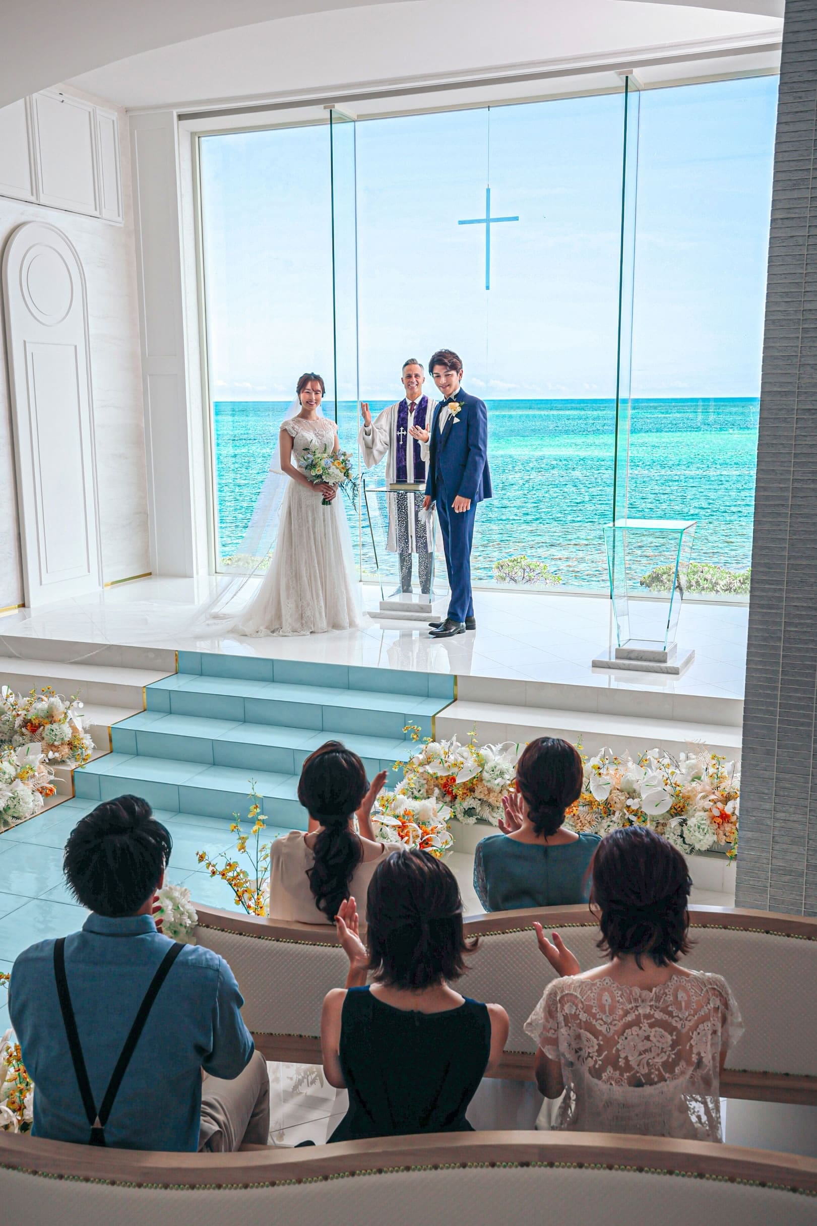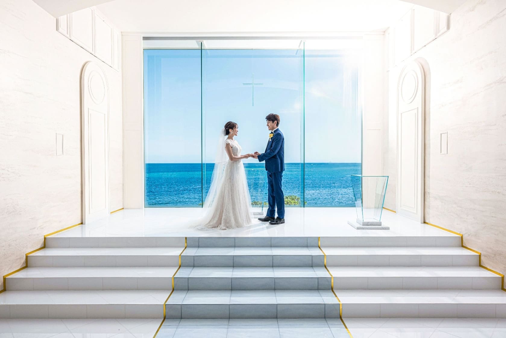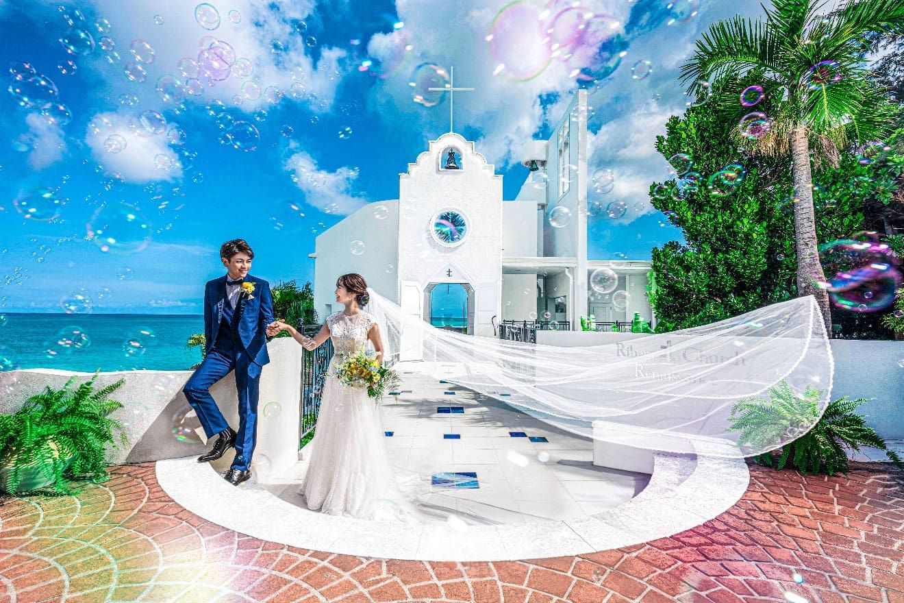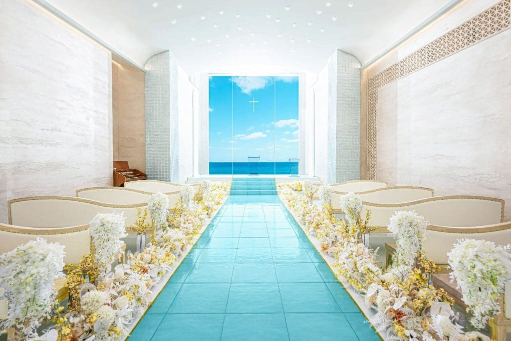 矗立在沖繩海岬上的海之心麗蓓菈教堂,採用獨棟設計的教堂,以地中海沿岸白牆教會作靈感,配置玻璃祭壇、全透明座位、玻璃的聖潔之路,特別是玻璃窗上的十字架,彷彿在海中舉行婚禮,極致浪漫。