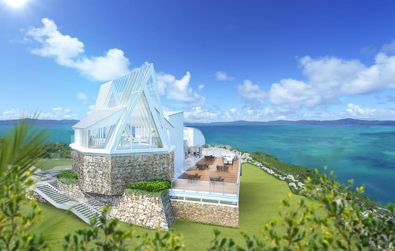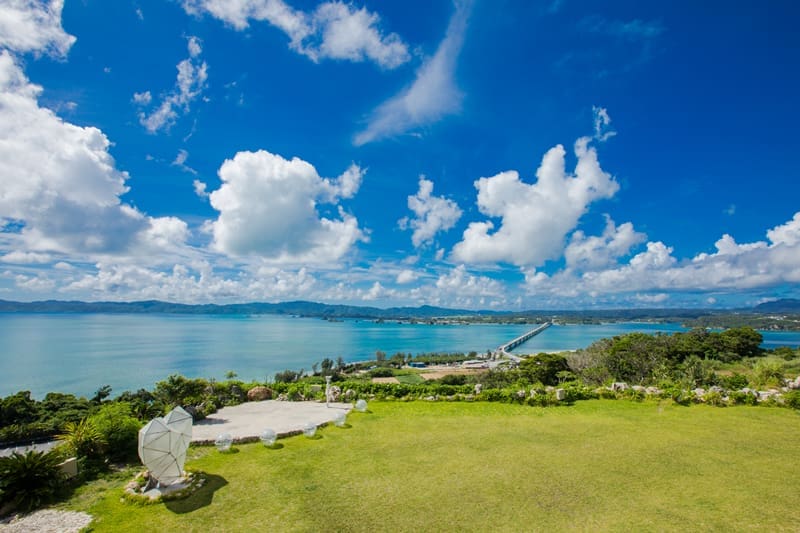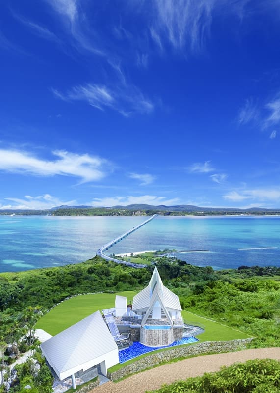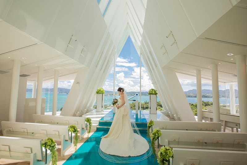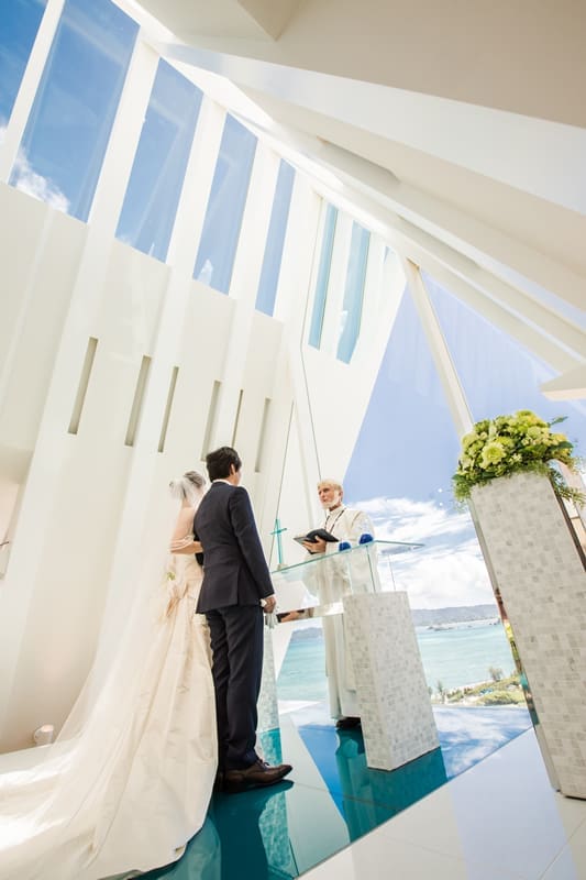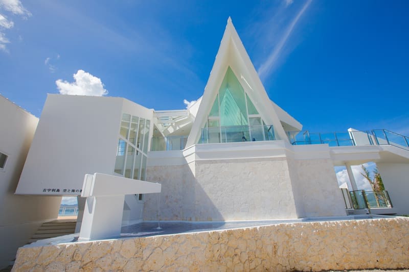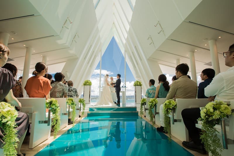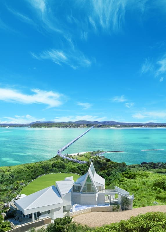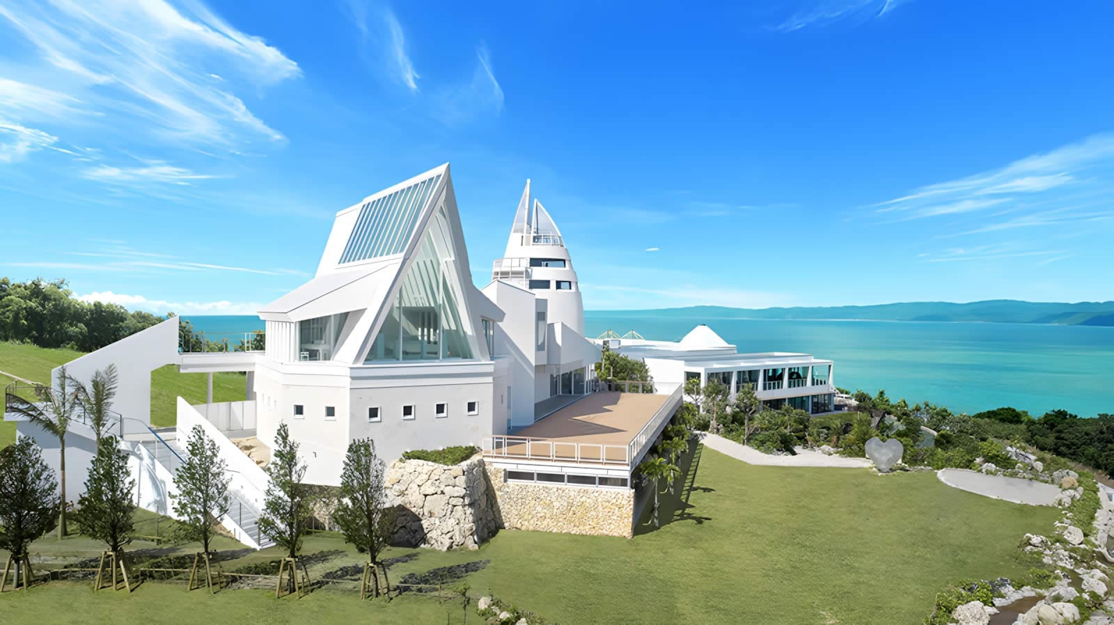 沖繩古宇利天空教堂(Kouri Island Celeste Chapel)位於沖繩本島北部的古宇利島上,從那霸機場出發車程約90分鐘。教堂依山傍海,面對湛藍的海洋與天空,擁有無敵海景與唯美玻璃帷幕設計,充滿浪漫氛圍。教堂最多可容納約40位賓客,適合小型溫馨婚禮。這裡是許多新人夢想中的海島婚禮首選地點。